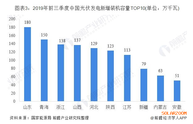 具體到各個(gè)省份來看,2019年前三季度,山東省新增裝機(jī)容量排名第一,達(dá)到180萬千瓦;青海和浙江緊隨其后,新增裝機(jī)容量分別為150萬千瓦和138萬千瓦。