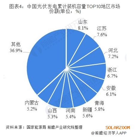 累計(jì)裝機(jī)容量方面,截至2019年第三季度,我國(guó)共有9個(gè)地區(qū)光伏發(fā)電累計(jì)裝機(jī)容量超過1000萬千瓦。其中山東以1541萬千瓦,排名第一,占全國(guó)總裝機(jī)容量的8.1%;江蘇和河北緊隨其后,分別以1445萬千瓦和1363瓦千瓦占全國(guó)總裝機(jī)容量的73.6%及7.2%。